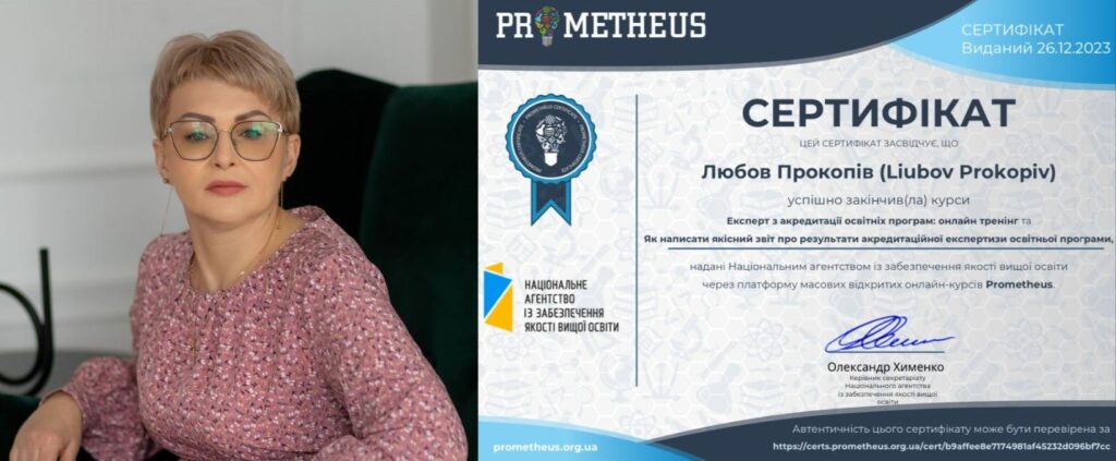 Розуміючи важливість ефективного впровадження заходів забезпечення якості вищої освіти та сприяння поширенню цінностей європейського освітнього простору в Прикарпатському національному університеті імені Василя Стефаника та в Україні загалом, Любов Миколаївна успішно пройшла навчання на платформі Prometheus й активно долучилася до формування національної мережі експертів з акредитації освітніх програм.