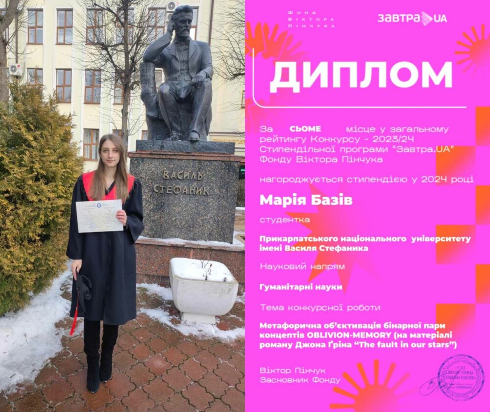 Переможницею вісімнадцятого конкурсу 2023/2024 стипендіальної програми «Завтра.UA» стала Марія Базів – студентка 2 курсу ОР Магістр факультету іноземних мов, спеціальності 035.041 Германські мови та літератури (переклад включно), перша – англійська. Тема конкурсної наукової роботи – «Метафорична Читати далі